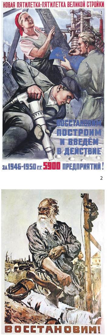 Радянські пропагандистські плакати часів відбудови. Написи на плакатах: 1) «Нова п’ятирічка — п’ятирічка великого будівництва. Відновимо, побудуємо і введемо в дію за 1946—1950 рр. 5900 підприємств»; 2) «Відновимо!»