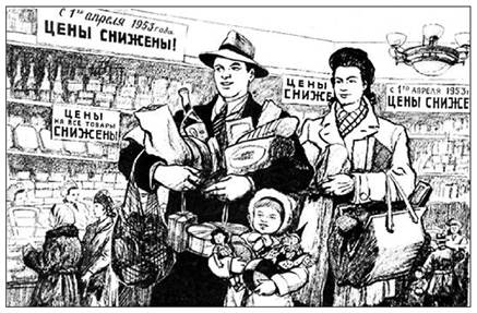 Радянський пропагандистський малюнок, який мав показати поліпшення рівня життя. Написи на малюнку: «Із 1 квітня 1953 р. ціни знижено», «Ціни на всі продукти знижено»