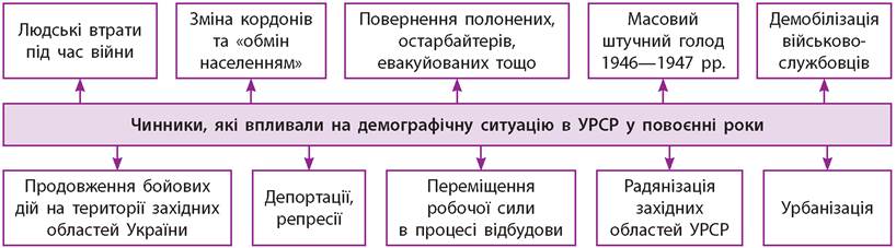 До рідних домівок повернулися близько 2,2 млн осіб, демобілізованих з лав радянської армії, сотні тисяч вивезених під час евакуації на схід, ті, хто перебував на примусових роботах або в полоні за межами України. Також за розпорядженням союзної влади до України прислали велику кількість спеціалістів та партійних діячів з інших республік СРСР для участі у відбудові господарства й радянізації західних областей. Відбудова й подальший розвиток промисловості прискорили процес урбанізації та призвели до скорочення кількості сільських жителів.
