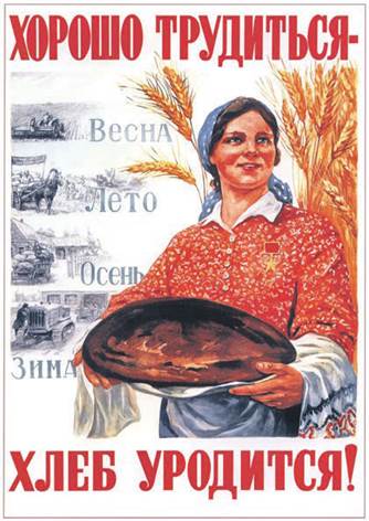 Радянський пропагандистський плакат. Напис на плакаті: «Добре працювати — хліб уродить!». 1947 р.
