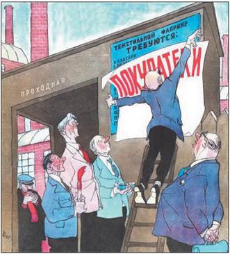 Радянська карикатура. Напис: «Текстильній фабриці потрібні: покупці». Художник І. Семенов