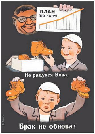 Радянський плакат «Будні планової економіки». 1965 р. Написи на плакаті: «План (за валом). Не радій, Вово... Брак не обнова!»