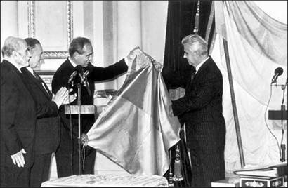 М. Плав’юк передає прапор УНР Президенту України Л. Кравчуку. Фотографія Національного музею історії України