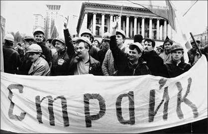 Шахтарі на майдані Незалежності в Києві. Приводом до масового страйку стало чергове підвищення цін на продукти. 1992 р.