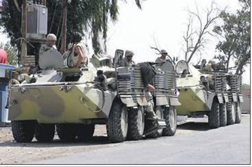 Патруль українських військових в Іраку. 2003 р. Військову службу в Іраку та Кувейті загалом пройшло понад 6 тис. українців. За час миротворчої місії українські військові сприяли будівництву й ремонту шкіл, дитячих садків, автошляхів, ліній електропередач, об’єктів водопостачання, надавали медичну допомогу місцевому населенню