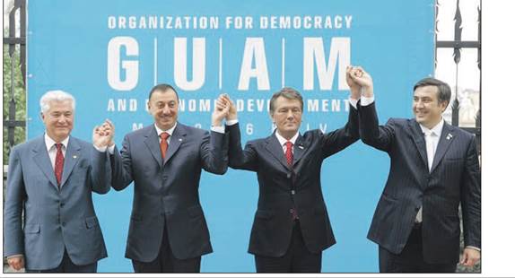 Президенти Молдови, Азербайджану, України та Грузії Володимир Воронін, Ільхам Алієв, Віктор Ющенко і Міхаїл Саакашвілі під час третього саміту ГУАМ у Києві. 23 травня 2006 р.