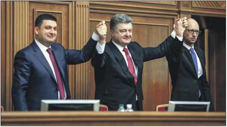 Голова Верховної Ради України В. Гройсман, Президент України П. Порошенко та Прем’єр-міністр України А. Яценюк. 2015 р.