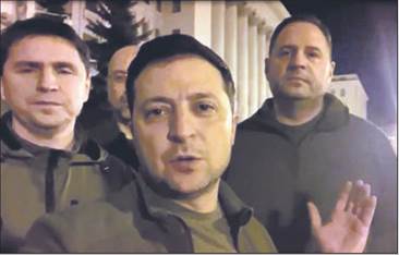 Президент Володимир Зеленський, Прем’єр-міністр Денис Шмигаль, голова фракції «Слуга народу» Давид Арахамія, керівник Офісу Президента Андрій Єрмак і його радник Михайло Подоляк записали відеозвернення біля будівлі Офісу Президента та повідомили, що залишаються в Києві виконувати свої обов’язки. 25 лютого 2022 р.