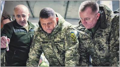 Головнокомандувач ЗСУ (27 липня 2021 — 8 лютого 2024 р.) Валерій Залужний (у центрі) і начальник Генерального штабу Сергій Шаптала (праворуч) за оперативною роботою на передовій