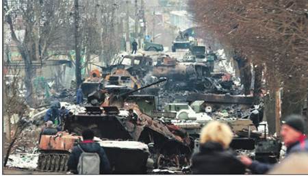Вулиця Вокзальна в Бучі з розбитою технікою армії РФ. 2022 р.