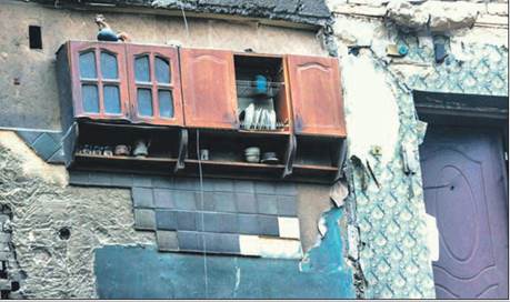 Стіна зруйнованого будинку в місті Бородянка (Київська область). Вціліла кухонна шафа з півником стала символом стійкості й нескореності. Березень-квітень 2022 р.