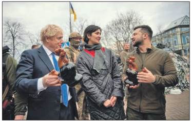 Прем’єр-міністр Великої Британії Б. Джонсон, Президент України В. Зеленський і харківська мисткиня Лєра Полянскова, яка подарувала їм фігурки відомого півника з Бородянки. 2022 р.