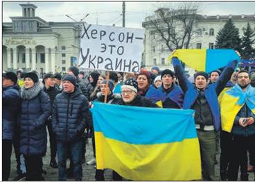 Мітинг проти російської окупації в Херсоні. Напис на плакаті: «Херсон — це Україна». 5 березня 2022 р.