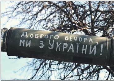 Гармата українського танку з написом «Доброго вечора, ми з України». 2022 р.