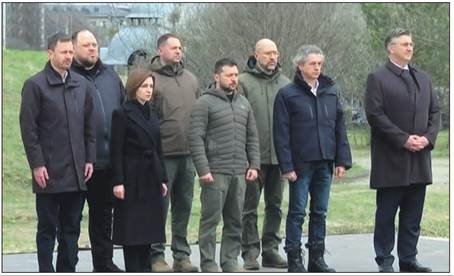 Президент України Володимир Зеленський, Прем’єр-міністр Денис Шмигаль, Голова Верховної Ради Руслан Стефанчук, керівник Офісу Президента України Андрій Єрмак, голова уряду Словаччини Едуард Гегер, прем’єр-міністр Словенії Робер Голоб, прем’єр-міністр Хорватії Андрей Пленкович і президентка Молдови Мая Санду. Буча (Київська область). 31 березня 2023 р. (річниця звільнення від російської окупації)