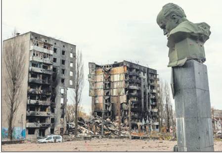 Пошкоджений монумент Т. Шевченку на тлі руйнувань від російських обстрілів у Бородянці (Київська область). 2022 р.