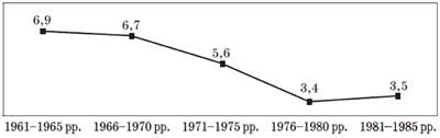 Темпи приросту основних показників економічного розвитку УРСР другої половини 1960-х - середини 1980-х років (%)