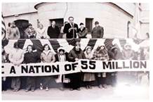Акція протесту в місті Філадельфія (США), яку організував Комітет оборони Валентина Мороза наприкінці 1980-х років. Напис на плакаті: «Україна — нація 55 мільйонів політичних в’язнів». Світлина