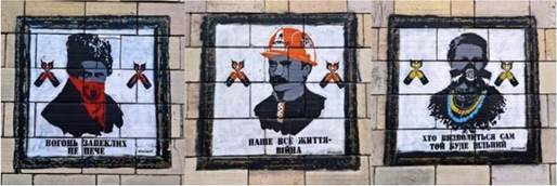 Триптих зі стилізованими портретами Тараса Шевченка, Івана Франка та Лесі Українки «Ікони революції». Київ, вул. Грушевського, лютий 2014 року. Анонімний вуличний художник Sociopath. Світлина