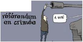 16 березня проведено так званий «референдум» щодо статусу Криму. Позаяк він відбувся під контролем зелених чоловічків, його результати заздалегідь були прогнозованими. 17 березня 2014 року Верховна Рада Криму проголосувала за «незалежність», а вже наступного дня Крим прийняли до складу РФ. США і Євросоюз засудили такі дії і запровадили санкції щодо російського бізнесу і високопосадовців. 27 березня 2014 року Генеральна Асамблея ООН ухвалила резолюцію на підтримку територіальної цілісності України. 2 липня 2014 року Парламентська асамблея Організації з безпеки і співробітництва в Європі визнала дії Росії військовою агресією.