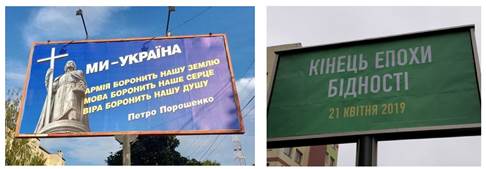 Білборди з передвиборчою агітацією Петра Порошенка (зліва) і Володимира Зеленського (справа). Світлини