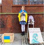 6-річна Софія Реут грає на флейті. Напис на плакаті поруч «На бронікі захисникам», травень 2022 року. Світлина