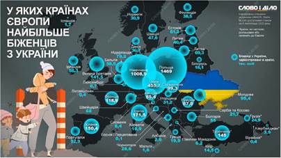 - 2. На основі картосхеми назвіть 5 країн Європи, які прийняли найбільшу кількість українців. Висловіть припущення, чим це зумовлено.
