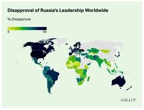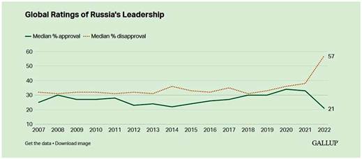 Соціологічне опитування проводилося Gallup у 137 країнах та регіонах. Опитування стосувалося ставлення мешканців різних країн до дій Росії. Якщо в період з 2007 по 2019 рік дії Росії не схвалювали від 20 до 30% респондентів, то у 2021 році рівень несхвалення сягнув 38%. Натомість у 2022 році не схвалювали дії керівництва Росії 57% опитаних. Загалом у 81-й із 137 досліджуваних країн не схвалювали дії керівництва Росії. Найвищий рівень несхвалення продемонстрували: Польща — 95%, США — 93%, Канада — 91 %.
