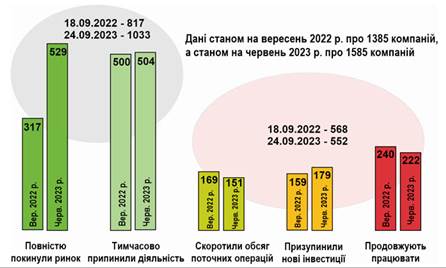 1. Проаналізуйте, скільки іноземних компаній у 2022-2023 роках: а) повністю покинули російський ринок; б) тимчасово припинили свою діяльність. Кількість таких компаній зросла чи зменшилась? Про що це свідчить?