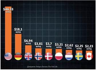 Основні донори військової допомоги Україні станом на грудень 2023 року (джерело: інтернет-видання «Радіо Свобода»)