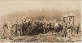 Українські військовополонені в супроводі конвою перед брамою табору Фрайштадт