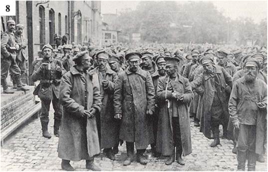 Проаналізуйте джерела 6-8, виконайте завдання і дайте відповіді на запитання. • 1. Роздивіться людей на фотографіях. Про які почуття і настрої говорять їхні обличчя, постаті й жести? Чи співчуваєте ви цим людям? • 2. Які нові явища соціального життя постали внаслідок воєнних подій? Чи були з-поміж них такі, що згодом могли спричинити важливі суспільні зрушення?