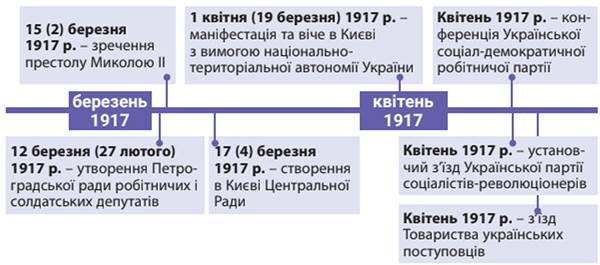 Товариство українських поступовців (ТУП), українські соціал-демократи та інші громадські й політичні організації, керуючись інструкцією Тимчасового уряду щодо місцевих рад об’єднаних громадських організацій, 17 (4) березня 1917 р. заснували раду не губернського, а всеукраїнського масштабу - Українську Центральну Раду (УЦР).