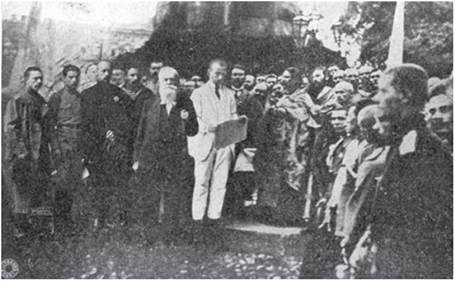 Проголошення Першого Універсалу Української Центральної Ради на Софійській площі в Києві. Текст Універсалу зачитує член УЦР, кооператор і публіцист Микола Ковалевський, ліворуч від нього — Михайло Грушевський. 23 (10) червня 1917 р.