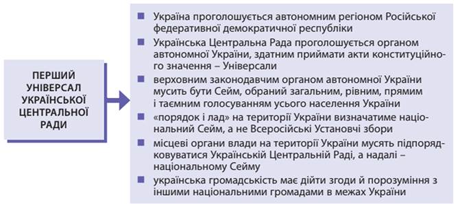Одним із кульмінаційних моментів Української революції було ухвалення Першого Універсалу. Тимчасовий уряд не може дати ладу в Україні, тому «однині самі будемо творити наше життя» — йшлося в ньому. Сучасні історики, говорячи про історичне значення Першого Універсалу УЦР, наголошують, що він засвідчив подальший поступ Української революції, зростання авторитету Української Центральної Ради й розгортання державотворчих процесів на українських теренах.