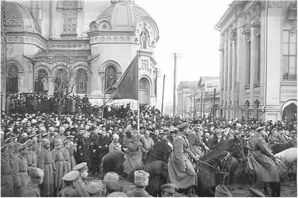 Урочисте відкриття Третього Всеукраїнського військового з’їзду на Софійській площі в Києві. У центрі (зліва направо): С. Петлюра, В. Винниченко, М. Грушевський. 2 листопада (20 жовтня) 1917 р.