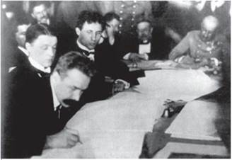 Підписання українською делегацією (М. Левитський, О. Севрюк, М. Любинський) Брестського мирного договору. 9 лютого (27 січня) 1918 р.