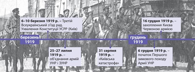 1. Установіть хронологічну послідовність подій: • початок Першого зимового походу Армії УНР • ухвалення першої Конституції УСРР • «Київська катастрофа».