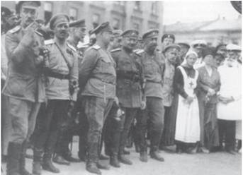 Голова Директорії УНР С. Петлюра (у центрі) серед політичних і військових діячів УНР. Праворуч від нього — М. Омелянович-Павленко