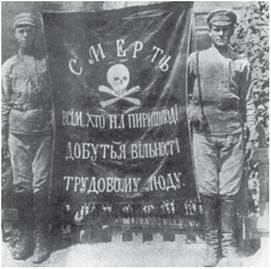 Зі статті голови ВУЧК М. Лациса: «У зв'язку з авантюрою отамана Григор'єва Рада оборони оголосила червоний терор стосовно лівих соціалістів-революціонерів-активістів і "незалежників"-активістів... Хто не з нами, той проти нас... Ми вдаримо по ворогу... ми повинні розстрілювати на місці кожного, хто взяв або збирається взяти проти нас зброю. Нам це диктує здоровий глузд, наш інстинкт самозбереження. Червоний терор необхідний. Це змушена дія до самозахисту».