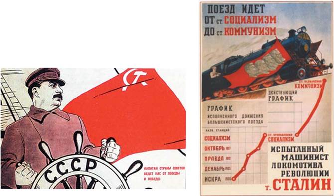 Радянські агітаційні плакати: «Капітан Країни Рад веде нас від перемоги до перемоги!»; «Потяг іде від ст. “Соціалізм” до ст. “Комунізм”. Випробуваний машиніст локомотива революції т. Сталін» (російською мовою). 30-ті роки XX ст.