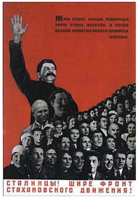 Радянський агітаційний плакат зі словами Сталіна на І Всесоюзній нараді робітників та робітниць — стахановців: «Жити стало краще, товариші, жити стало веселіше, а коли весело живеться, робота ладнається». 1935 р.