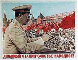 Напис на плакаті: «Любий Сталін — щастя народне!» (російською мовою). Яку лінію партії демонстрував глядачам цей плакат?