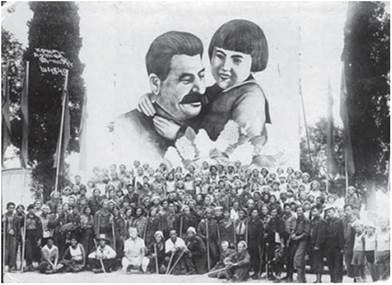 Плакат із зображенням Сталіна з дівчинкою Гелею (Енгельсіною) Маркізовою. Сталіна — «найкращого друга дітей» — сфотографовано 1936 р. у Кремлі на офіційному прийнятті трудящих Бурят-Монгольської АРСР Невдовзі батька Гелі було розстріляно як ворога народу, матір заарештовано, вона вкоротила собі віку.