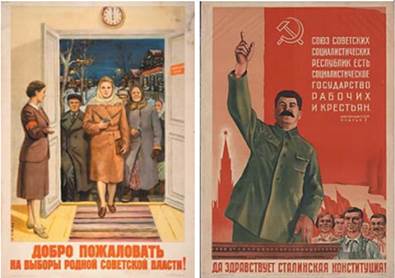 Написи на плакатах: «Ласкаво просимо на вибори рідної радянської влади!»; «Союз Радянських Соціалістичних Республік є соціалістичною державою робітників і селян (Конституція СРСР Стаття 1). Нехай живе сталінська Конституція!» (російською мовою). Які деталі на плакатах указують на тоталітарний характер режиму в країні попри гасла про народовладдя? Як пропагандистська продукція свідчить про поширення культу особи в країні? Чому художники, попри очевидне надуживання образом генсека, не могли не зобразити його на плакаті? Чи можна твердити, шо пропаганда, усупереч настановам, стала доказом тоталітаризму та культу особи?