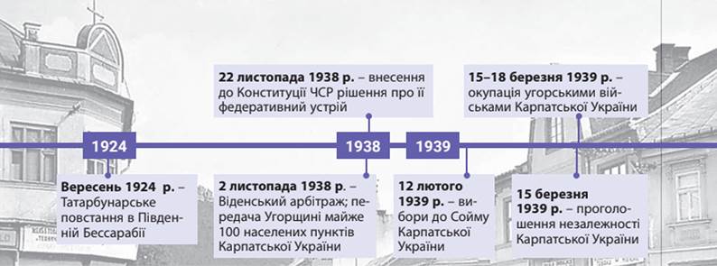 1. Установіть хронологічну послідовність подій: • вибори до Сойму Карпатської України • Віденський арбітраж • проголошення незалежності Карпатської України • Татарбунарське повстання в Південній Бессарабії.