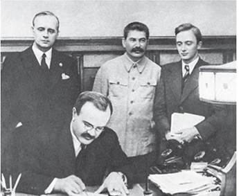 Від березня 1939 р. у Москві тяглися безрезультатні переговори з представниками Великої Британії та Франції про створення системи колективної безпеки проти країни-агресора. Саме з цього часу Сталін почав шукати можливість порозумітися з Німеччиною. 23 серпня в Москву прибув міністр закордонних справ Третього райху Й. фон Ріббентроп. Метою цього візиту було підписання згідно з попередньою домовленістю Договору про ненапад між СРСР і Німеччиною. Того самого дня, пізно ввечері, у Кремлі було підписано, а наступного дня опубліковано Договір про ненапад терміном на 10 років. Таємний додатковий протокол про розмежування «сфери обопільних інтересів» у Східній і Південно-Східній Європі, звісно ж, оприлюднено не було. До радянської сфери впливу згідно з ним належали Латвія, Естонія, Фінляндія та Бесарабія; Литву визнано сферою впливу Німеччини; територію Польщі учасники угоди поділили між собою по лінії річок Нарев, Вісла, Сян.