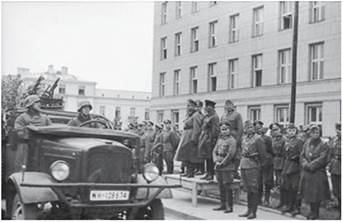Парад з нагоди передання Бреста частинам Червоної армії. На трибуні — німецький генерал X. Гудеріан і радянський комбриг С. Кривошеїн. 22 вересня 1939 р.