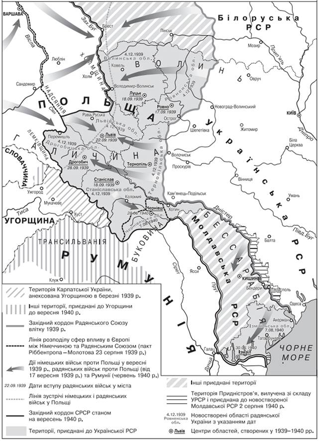 2. Покажіть на карті зміни адміністративно-територіального устрою УРСР упродовж 1939-1940 рр. Покажіть на карті події, з якими пов'язані ці зміни.