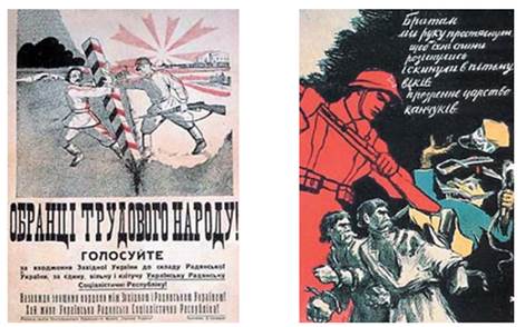 Червона армія прийшла в Західну Україну, Бессарабію та Північну Буковину з гаслами возз’єднання західноукраїнських земель з Українською Радянською Соціалістичною Республікою у складі СРСР Радянська пропаганда наголошувала, що віднині українці — колишні громадяни Польщі та Румунії - користуватимуться всіма національними правами в єдиній радянській Україні.